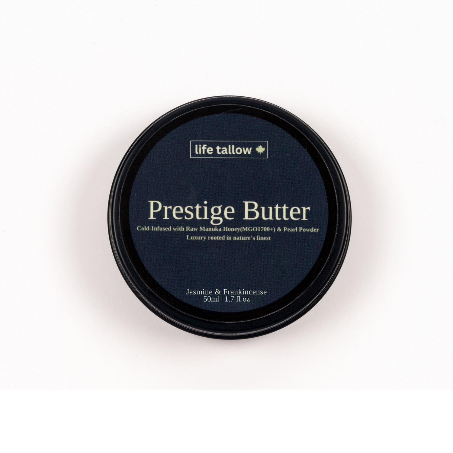 Prestige Butter stands at the pinnacle of anti-aging care β cold-infused with raw Manuka honey, castor oil, pearl powder, and essential oils to preserve the full strength of every rare ingredient. Available unscented or delicately scented with jasmine & frankincense.