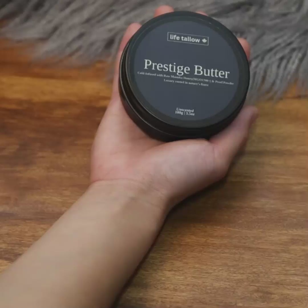 Prestige Butter stands at the pinnacle of anti-aging care β cold-infused with raw Manuka honey, castor oil, pearl powder, and essential oils to preserve the full strength of every rare ingredient. Available unscented or delicately scented with jasmine & frankincense.